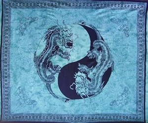 Product Description : YIN YANG DRAGON TAPESTRY ~ Yin Yang dragon tapestry or spread in mottled turquoise with geometric border. Made of 100% power-loom cotton and measures approximately 88 x 108 inches. They are colorfast and can be machine washed on cool/gentle and tumble dried. The Yin Yang symbol goes back to the days of Confucianism. It symbolizes the balance of positive and negative in all things. It is said that Yin will become Yang and Yang will become Yin, therefore one cannot exist without the other. It is believed that dragons had the gift of vision, wisdom, and prophecy and were considered to be the guardians of all knowledge and wisdom. He is the symbol of good fortune that can bring all manner of blessings and luck. Even today the dragon still adorns homes and businesses through out the orient. A light to mid weight material with endless versatility. Use your Yin Yang Dragon tapestry for: ~FURNITURE COVER~BEDSPREAD~ ~TABLECLOTH~BEACH BLANKET~ ~ROOM DIVIDER~A GREAT AFFORDABLE GIFT~ ~HANG THEM ON YOUR WALL OR CEILING~! It will delight and enchant you~:-)