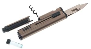 Product Description : Amazon.com ReviewA sort of culinary version of the Swiss army knife, this multi-purpose food tool is an indispensable item to pack for food preparation while picnicking, camping, or traveling. When closed, the compact tool resembles a very slim pair of binoculars and measures just 5-3/4 inches long and 1-1/2 inches wide. However, hidden within this sturdy, die-cast aluminum case are seven essential cooking tools for fixing on-the-go meals.The Food Tool includes a handy bottle cap opener carved into one side, a knife and a can opener that individually extend out one end, salt and pepper shakers that unscrew from the opposite end, and a corkscrew that swings out after removing a slide-off cover. The knife, corkscrew, can opener, and screwdriver are all constructed of high-quality stainless steel and the corkscrew also has a Teflon coating for smoother cork penetration. The salt and pepper shakers have secure snap-on lids to keep moisture out of seasonings.While this is an innovative travel tool, there are a few glitches to watch out for. Users should exercise caution when reaching into a knapsack or bag for this tool--the lever that retracts the knife does not lock so the blade can easily slide out if jostled. In addition, the cover for the corkscrew is difficult to line up properly and slide back on. The Food Tool is covered by Zelco under a one-year limited warranty. --Cristina Vaamonde Product Description : FoodTool is made of diecast aluminum, with a stainless steel corkscrew that is Teflon coated, easy to use bottle opener, with a hardened stainless steel knife, can opener with screwdriver tip, removable salt and pepper shakers. Compact size to 5.7" for storage. Great foir picnicking, camping, boating etc. Ideal to have in your car, bar, office and kitchen!