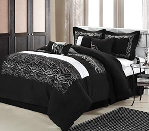 Product Description : Size: QueenThis exotic zebra-print comforter set takes your bedroom on a style safari. The bedding set features bold zebra patterns in shades of silver, black and white, and includes an ultra-plush comforter. One Queen Comforter 90 x 90One Queen bedskirt - 14" dropTwo Standard pillow shams 20" x 26" with a 2" flangeFour Decorative pillows 18 x 18 (2), 20 x 20, 9 x 14All quality polyester microfiberMachine washableColors: Black Silver & White