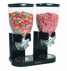 Product Description : Amazon.com Product Description : With its hermetically sealed design, this convenient cereal dispenser prevents cereal or other dry foods from going stale. Its simple, elegant design features two clear, see-through, high-quality plastic containers that hold 17 ounces each. Simply place a bowl under the dispenser and twist the knob to get a controlled portion--each twist doles out an ounce. Kids will enjoy turning the knob and watching cereal fall perfectly into their bowls, while parents can be assured that kids will not be spilling cereal all over the kitchen. The unit can also be used for storing and dispensing candy, granola, trail mix, nuts, and other dry foods. Attractively designed in black and chrome-plated housing, the double dry-food dispenser fits on most countertops and measures 7-1/2 by 13 by 16-2/7 inches. Product Description : The patented Zevro cereal dispenser prevents cereal or other dry foods from going stale. Kids will find it fun turning the knob and watching the cereal fall perfectly into their bowl while moms can be assured that kids will not be spilling cereal all over the kitchen. Best of all, the dispenser is hermetically sealed which preserves the freshness of dry food. Simply place a bowl under the dispenser and twist a knob to get a controlled portion. The simple, elegant design features two clear, see through, high quality plastic container's which hold one cereal box each. Very easy to clean and fit on most countertops.