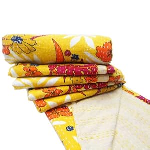 Product Description : - Hand stitched cotton reversible Kantha Quilt .- Both sides have different pattern.- The front and back side is in yellow color.- It has blue,magenta and orange color floral pattern.- Size: 86" X 107" Inches (QueenSize).-Weight - 1.676 Kg. This kantha quilt gives a traditional look to your room and can be used for decoration as well as for bedspread in your home.