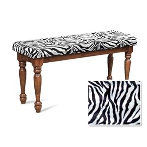 Product Description : This is a new solid wood large bench. It is done in an oak finish with a zebra print faux fur seat cushion. The cushion is 2" thick and very soft. It is great for use at the dining room table. Dimensions: 44" Long x 14" Wide x 20" Tall In this listing you will only receive the oak finish bench. Great for use at a dining table, entry way and covered patio. Be careful when trying to do your own color matching between products. Actual finish color may vary depending on your computer monitor settings. We are not responsible for color differences between your furniture and ours.